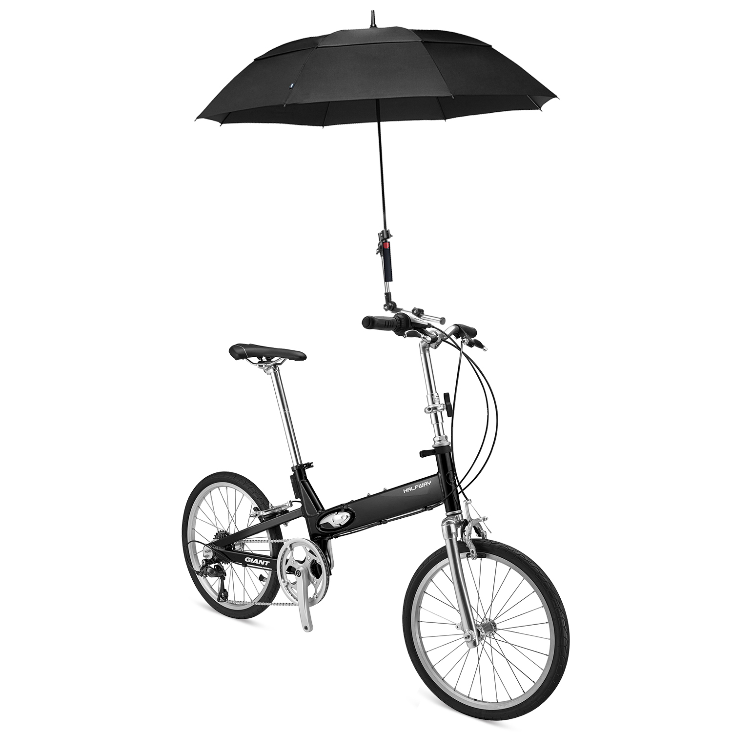 - Our 2-section Umbrella Handlebar Holder has a simple sleek design; it is very easy to mount on any bicycle with the handlebar between 17-23mm in diameter. Every part of this product is adjustable, so that you can change it to any angle you like. The height adjustable stem and the joint allow your umbrella to be adjusted to avoid sunlight or rain from any direction. It’s ideal to use in sunny or rainy days, and frees your hand to increase safety while riding. When not in use, it doesn’t take up much space as it can be easily folded for storage.