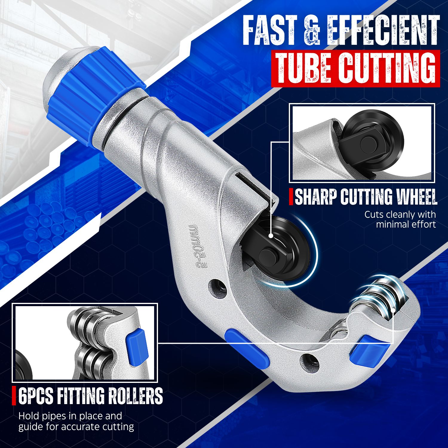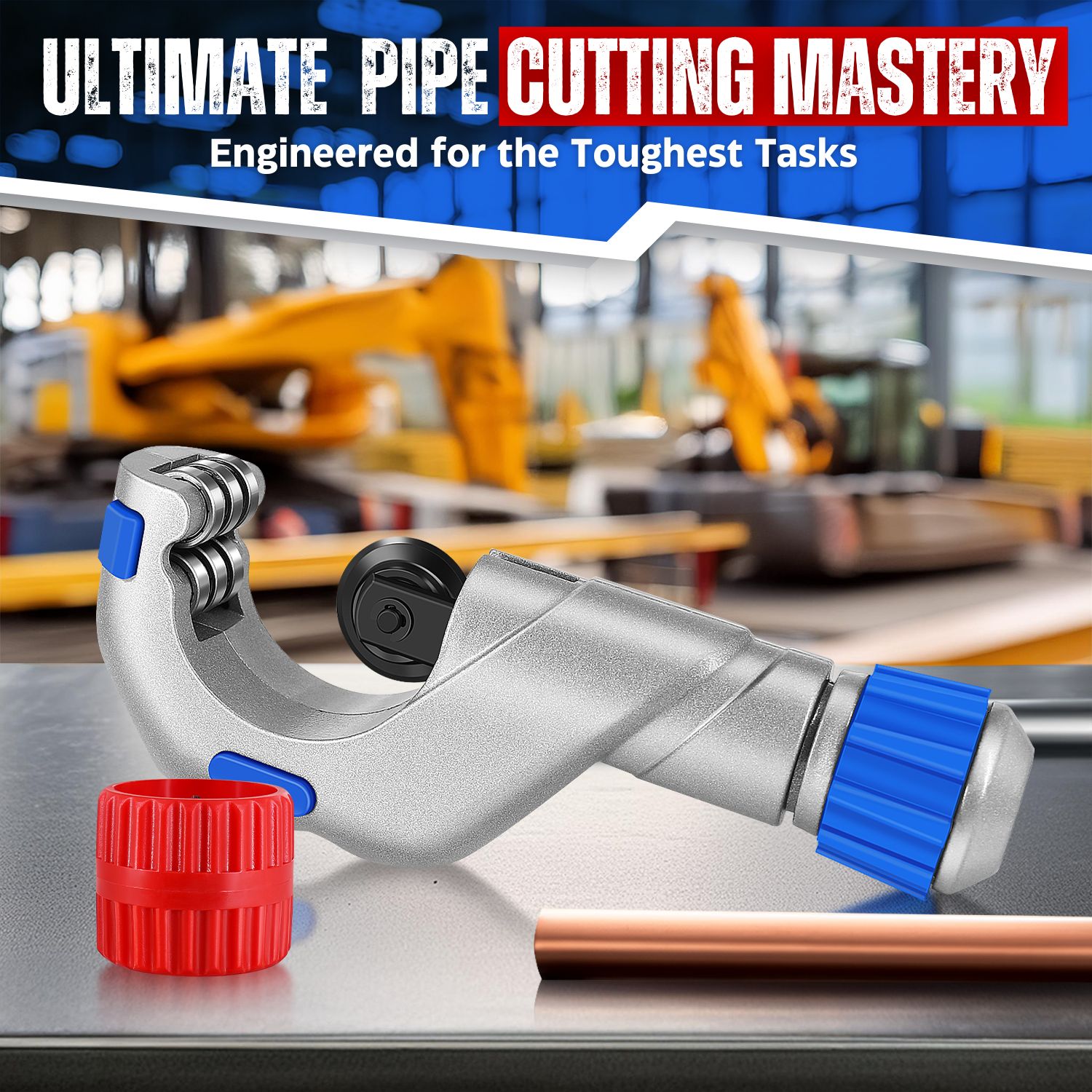 - Cut with precision and ease using the Flexzion Copper Pipe Cutter Tool Kit—designed for professionals and DIYers alike. This heavy-duty pipe cutter delivers clean, consistent cuts on a variety of materials, including copper, aluminum, PVC, and thin stainless steel pipes. With a cutting capacity of 3/16″ to 2″ (5–50mm), it’s ideal for plumbing, HVAC, and other home improvement projects. The included deburring tool helps ensure a smooth and safe finish by removing burrs from pipe edges. Featuring high-speed steel blades and radial ball bearings, guarantees smooth operation, accuracy, and durability.