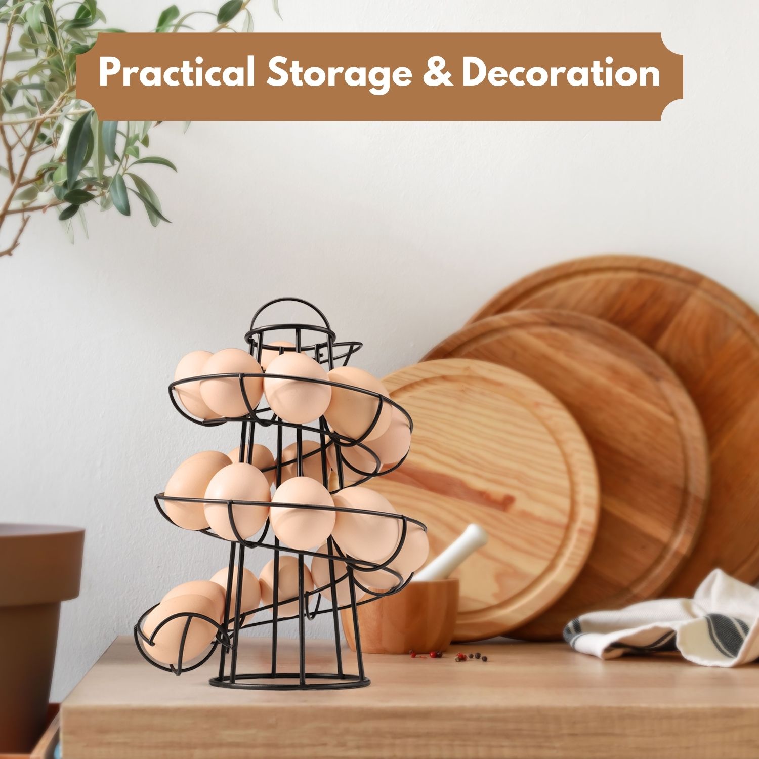 - Great Looking Eggcessory – This spiral egg dispenser / egg rack for fresh eggs will sit perfectly on any tabletop and complement your kitchen. Its sleek and modern space-saving design doesn’t require much storage space.